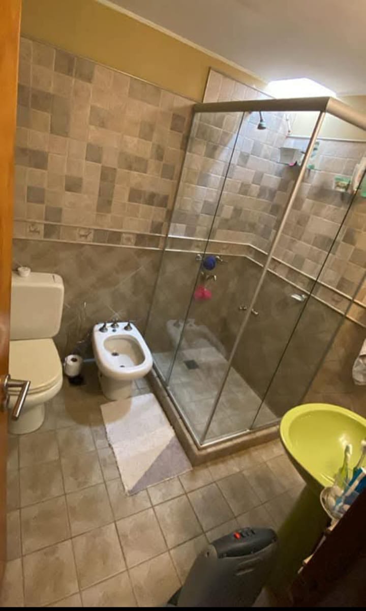 • Un baño completo con ducha y habitáculo con vidrio y mampara corrediza.